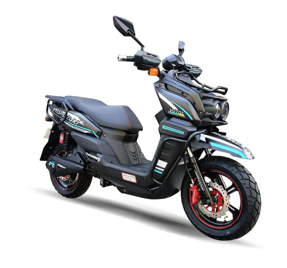 Motor voltaje 72V Controlador VOTOL EM100 Tipo de batería lithium ION Capacidad de batería – 1 batería / 72V 55AH 5 velocidades Muffler MP3, SD, USB Amortiguadores de gas Recorrido por carga de 140km-180km Tiempo de carga de batería 4 horas Velocímetro digital Sistema de frenos delantero de disco y trasero de disco Medida de Llanta: 120/80/12 Accesorios: Alarma, USB, Full Luces Led, Bluetooth, Mp3, Radio
